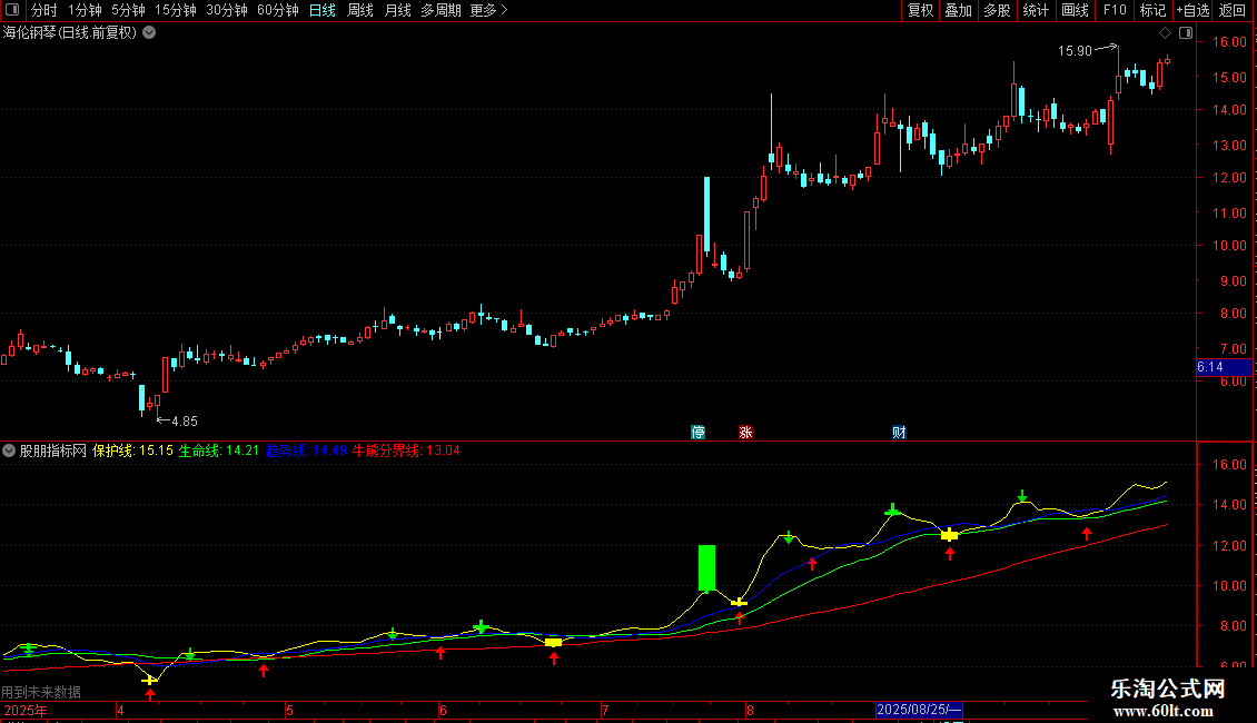 DRAWICON((ZIG(3,5)>REF(ZIG(3,5),1)) AND (REF(ZIG(3,5),1)<=REF(ZIG(3,5),2)) AND (REF(ZIG(3,5),2)<=REF(ZIG(3,5),3)),LOW*0.98,1) ;DRAWICON((ZIG(3,5)<REF(ZIG(3,5),1)) AND (REF(ZIG(3,5),1)>=REF(ZIG(3,5),2)) AND (REF(ZIG(3,5),2)>=REF(ZIG(3,5),3)),HIGH*1.01,2);VAR3:=(CLOSE-MA(CLOSE,6))/MA(CLOSE,6)*100;VAR4:=(CLOSE-MA(CLOSE,24))/MA(CLOSE,24)*100;VAR5:=(CLOSE-MA(CLOSE,32))/MA(CLOSE,32)*100;VAR6:=(VAR3+VAR4+VAR5)/3;VAR7:=EMA(VAR6,5);ZB:=EMA(EMA(VAR3,5),5)*3, COLORSTICK;VAR8:=IF(VAR6<=-20,10,0);VAR9:=HHV(VAR8,10);VARA:=IF(VAR9 AND CROSS(MA(CLOSE,3),MA(CLOSE,5)),20,0);K:=EMA(VAR7,5)*2, , COLORFF00FF;D:=EMA(K,5), , colorwhite;J:=K*3-D*2, ,coloryellow;VARB:=BETWEEN(CLOSE,MA(CLOSE,3),MA(CLOSE,5)) AND J>10;HS:=VOL/CAPITAL*100, , colorgreen;DRAWTEXT(VAR8=10 AND FILTER(VAR8=10,5),LOW*0.93,'接近底部');DRAWTEXT(VARA=20,LOW*0.95,'底部');保护线:MA(C,3),coloryellow;生命线:MA(C,21),colorgreen;趋势线:MA(C,12),colorblue; 牛熊分界线:MA(C,55),colorred; VAR1:=ZIG(3,10)<REF(ZIG(3,10),1) AND REF(ZIG(3,10),1)>REF(ZIG(3,10),2); VAR2:=ZIG(3,10)>REF(ZIG(3,10),1) AND REF(ZIG(3,10),1)<REF(ZIG(3,10),2);STICKLINE(VAR1,C,O,8,0),colorgreen,LINETHICK2;STICKLINE(VAR1,C,O,3,0),colorgreen,LINETHICK2; STICKLINE(VAR1,H,L,1,0),colorgreen,LINETHICK2; STICKLINE(VAR2,C,O,8,0),coloryellow,LINETHICK2; STICKLINE(VAR2,C,O,3,0),coloryellow,LINETHICK2; STICKLINE(VAR2,H,L,1,0),coloryellow,LINETHICK2;