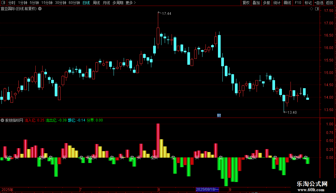 流出亿:IF(CLOSE>OPEN,0-VAR1*((HIGH-CLOSE)+(OPEN-LOW)),IF(CLOSE<OPEN,0-VAR1*(HIGH-LOW),0-AMOUNT/2))/100000000,COLOR00FF00,NODRAW;