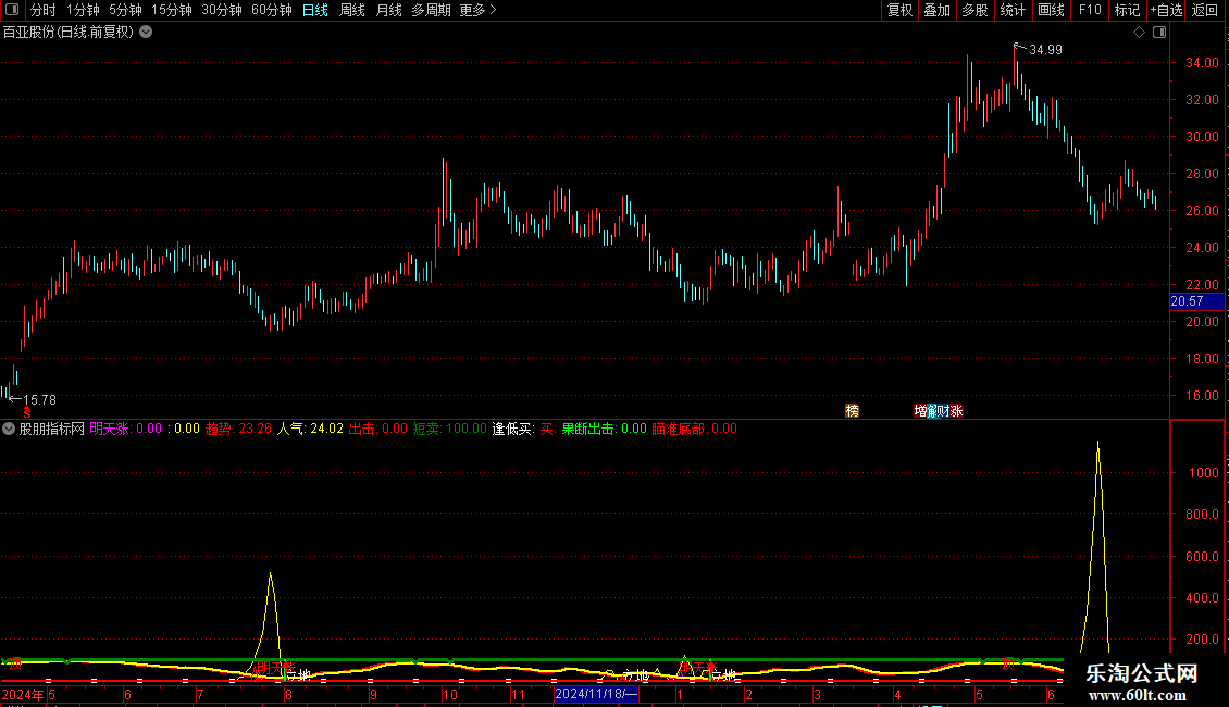 出击:IF(CROSS(趋势,人气) AND (趋势<30),20,0),COLOR0000FF,LINETHICK2;