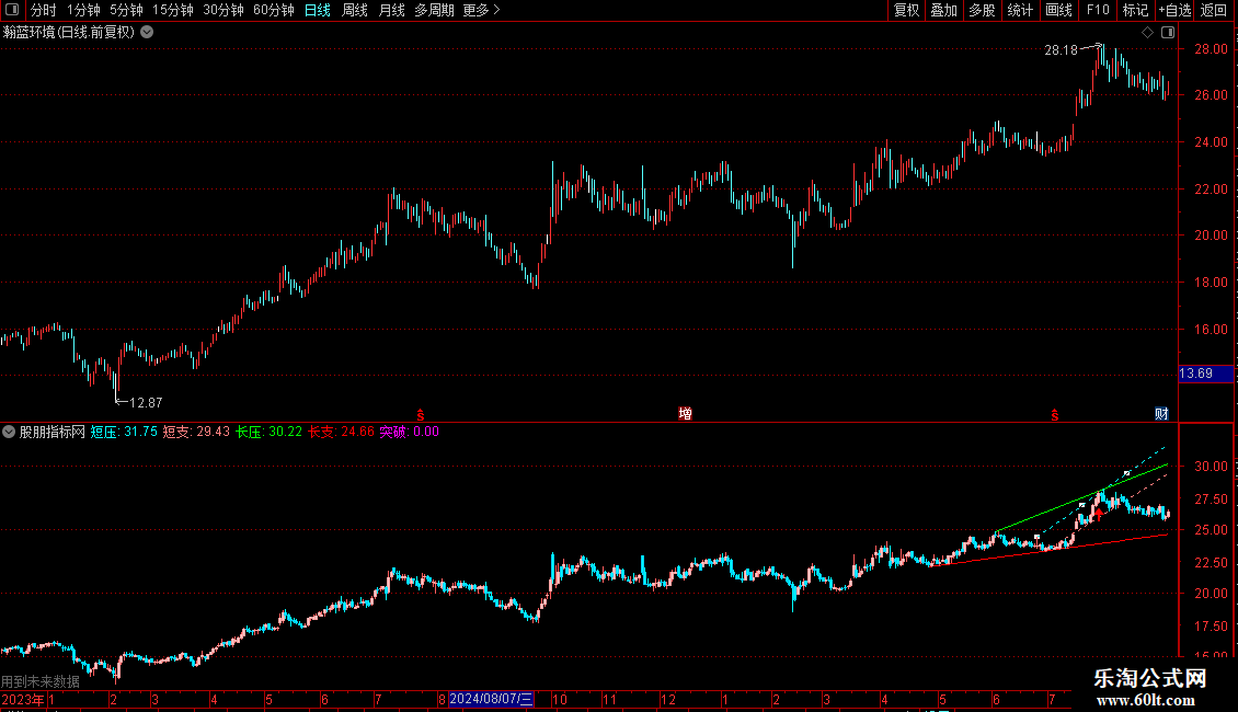 F1:=E1>REF(E1,1);短压:DRAWLINE(D1,H,F1,H,1),COLORCYAN,DOTLINE;