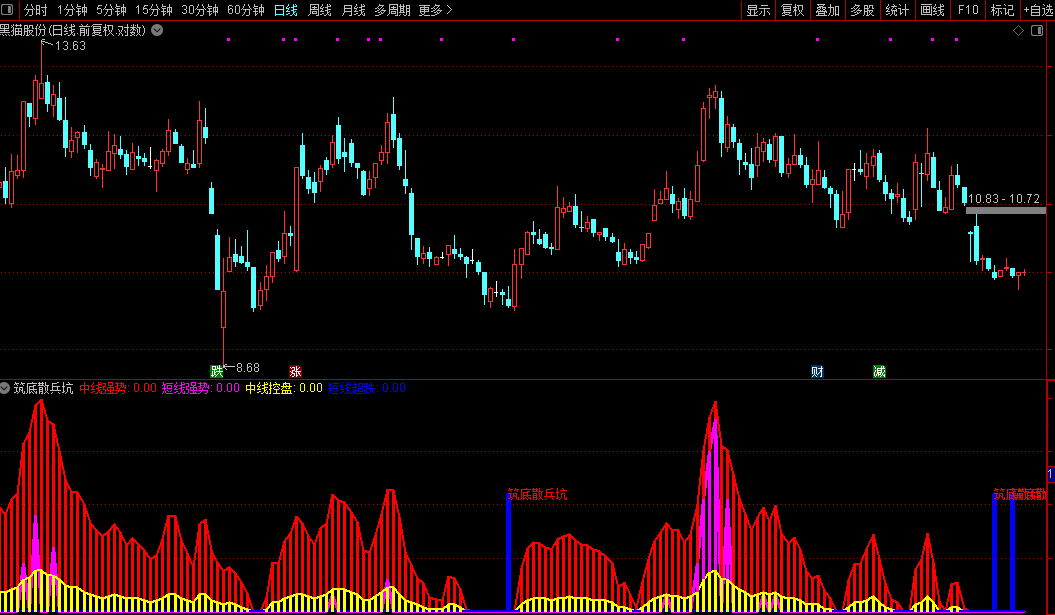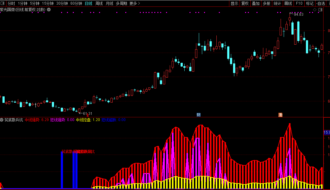 使用时重点关注:当中线强势指标持续走强,同时出现紫色短线强势信号,配合散兵坑筑底形态,即为较佳介入时机。黄色中线控盘线可验证趋势持续性,蓝色短线超跌区域则提示反弹机会。该指标适用于中短线操作,能有效识别主力建仓阶段的特征形态。