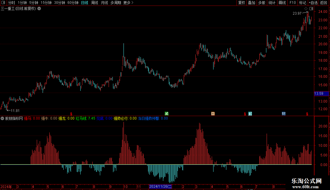 强势必行: IF(FILTER(红马线>0 AND 强马 AND 红马线>0 AND 强牛 OR 红马线>0 AND 强龙,5)=1,30,0),linethick2 , COLORYELLOW;