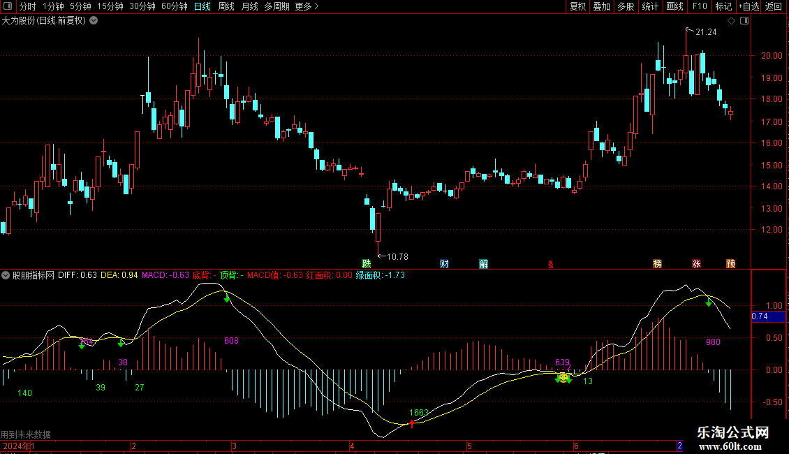 顶背:DRAWLINE(A2=0,DEA,顶背离,DEA,0),COLORGREEN,LINETHICK4;