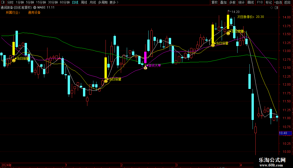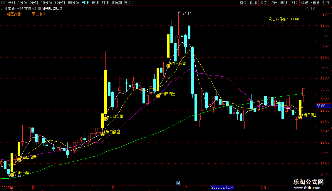 DRAWTEXT(倍量条件 AND NOT(游资信号),L*1,' ★当日倍量'),COLORYELLOW;