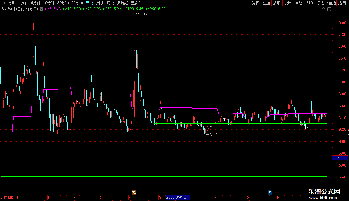 图中每条线都是压力线,相反每一条也是支撑线。指标在沙盘推演中,可以看到股价在一些压力点附近来回震荡,下跌过程中绿线成为支撑点,上涨过程中绿线就成了压力点。