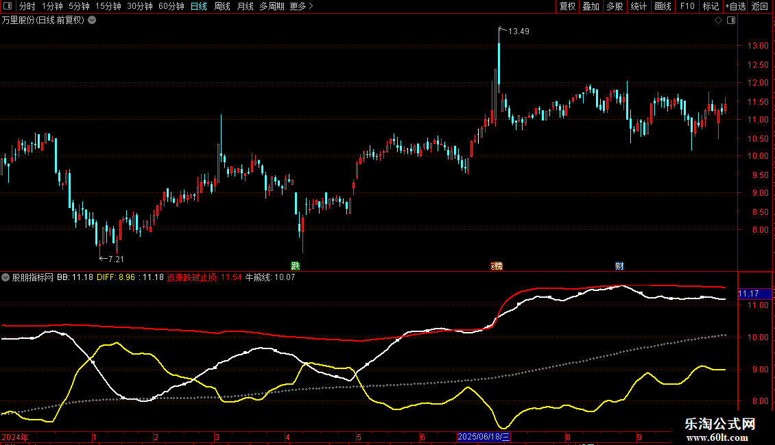 五,这点很重要,黄下穿白,红线的位置不能太高,那样的话,证明下面是小震荡或者回调,其实穿入也维持不了多久,所以抓大牛要参考红线,红线明显看出隔几天就会穿越K线就行,这个很容易看出