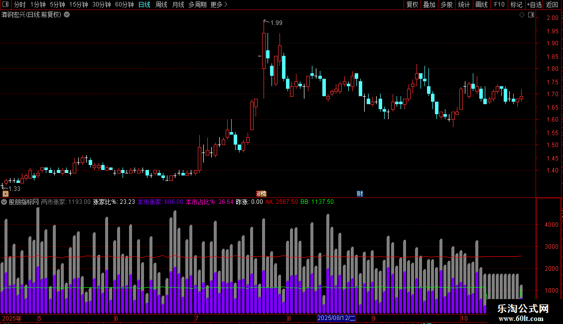 输出AA:两市总家/2,COLOR0000FF,线宽为1