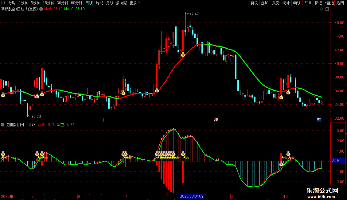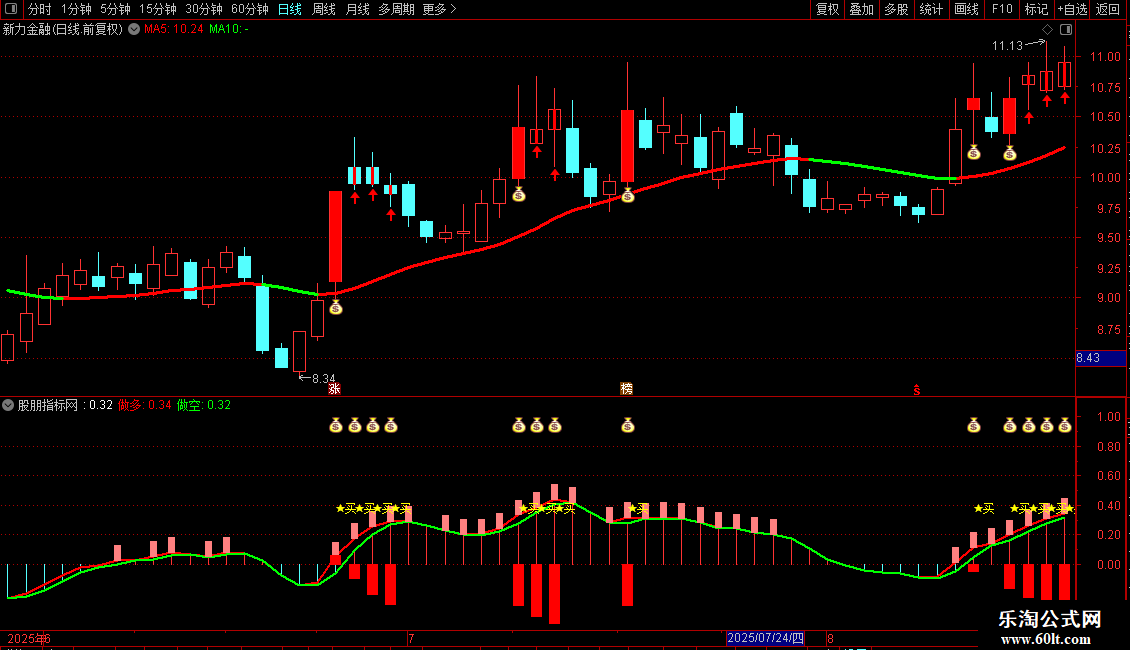 2.当副图红色量能柱与钱袋子图标形成共振,即为趋势启动信号确认。该组合信号可有效辅助判断趋势主升阶段,适合追求长期收益的投资者参考使用。