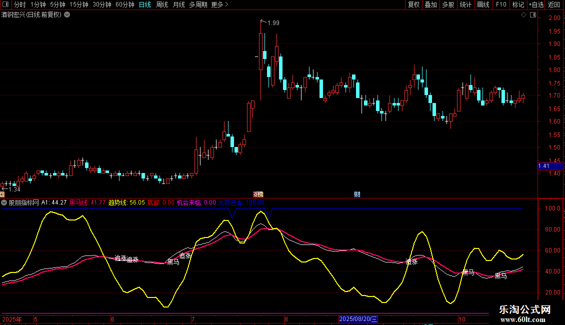 黑马线:EMA(A1,5),LINETHICK2,COLOR6600FF;