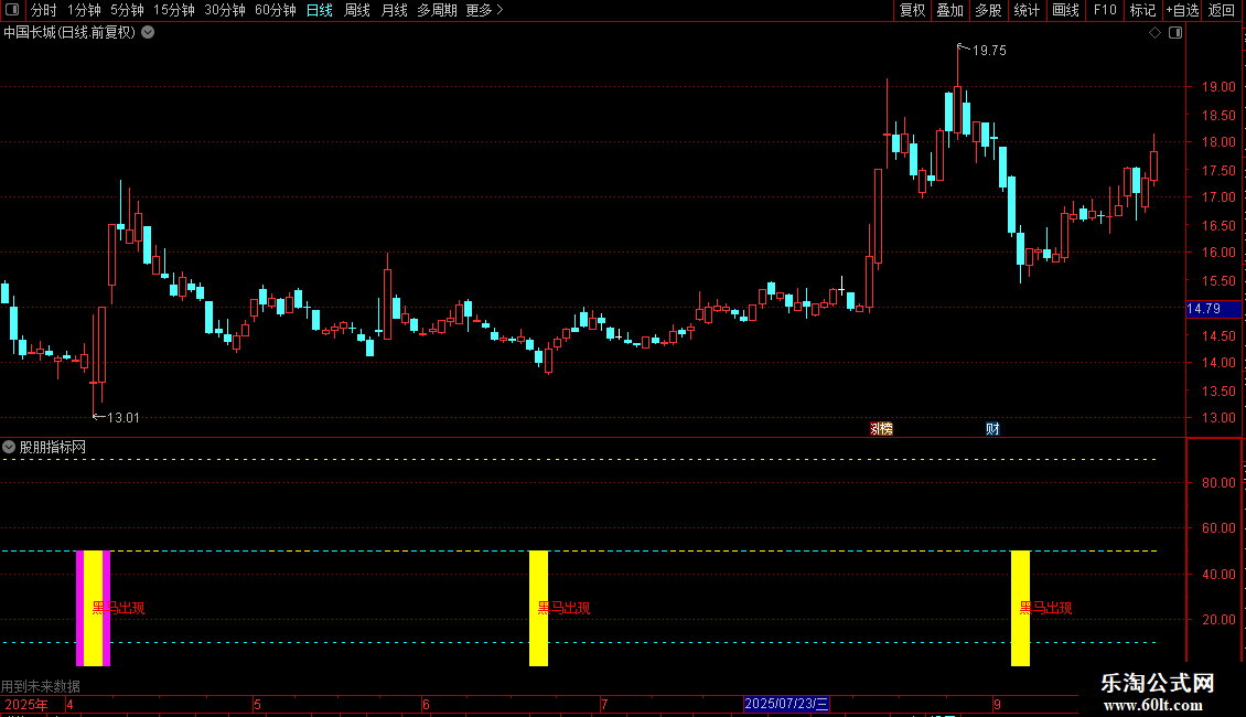 DRAWTEXT(FILTER(VARF=1,3),25,'黑马出现'),COLORRED ;