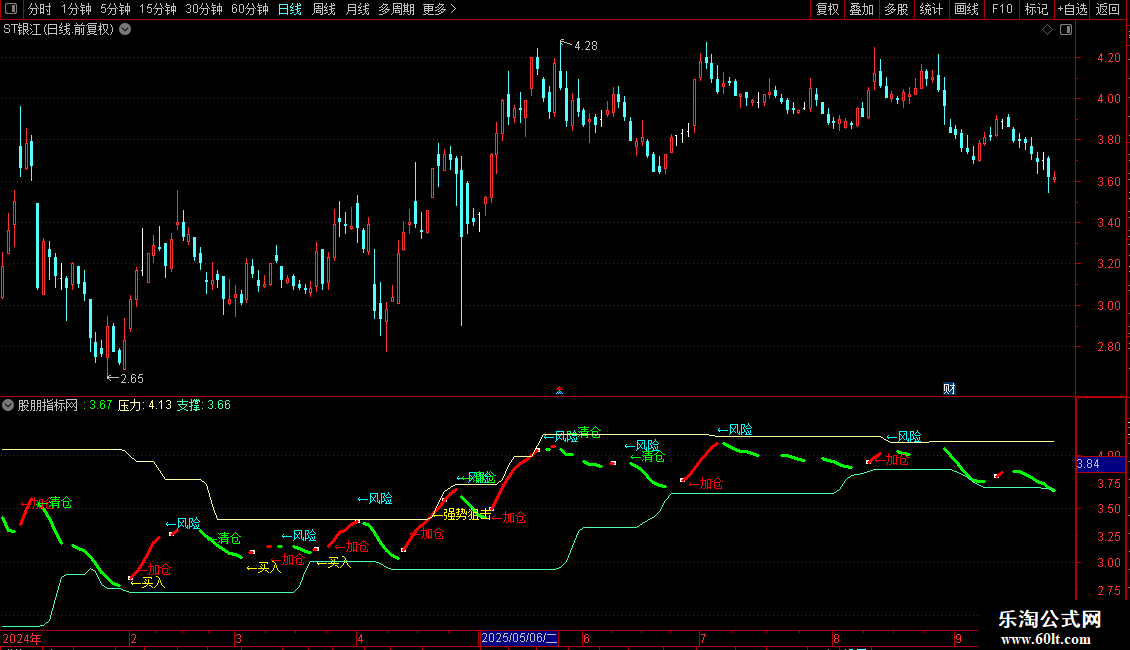 DRAWTEXT(减仓,HIGH*1.02,'←风险'),COLORCYAN;