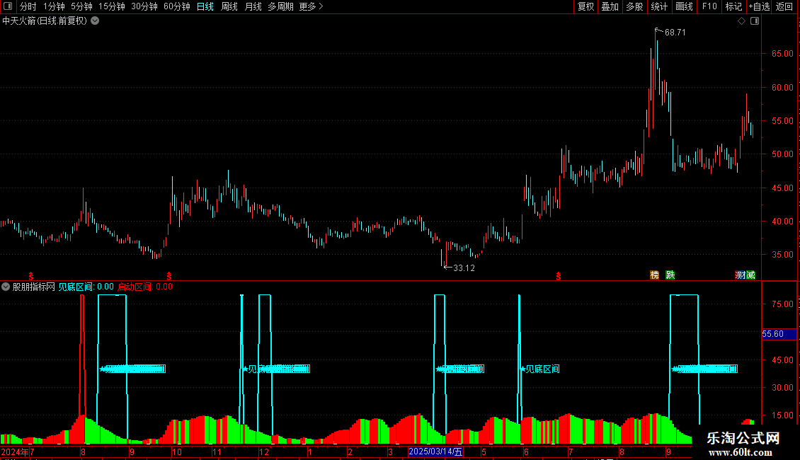指标通过计算价格在近期高低点之间的相对位置,判断股票的底部和启动信号。主要功能是识别两种关键时机:当股价长期弱势后出现企稳迹象时标记为“见底区间”;当股价连续走强且动量充足时标记为“启动区间”。操作策略是在见底区间关注潜在反转机会,在启动区间考虑跟进。