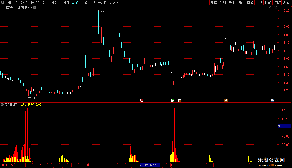 动态底部:EMA(IF(L<= LLV(L,30),SMA(ABS(L-REF(L,1)),30,1)/SMA(MAX(L-REF(L,1),0),30,1),0),3)*10,STICK,COLORYELLOW,LINETHICK2;