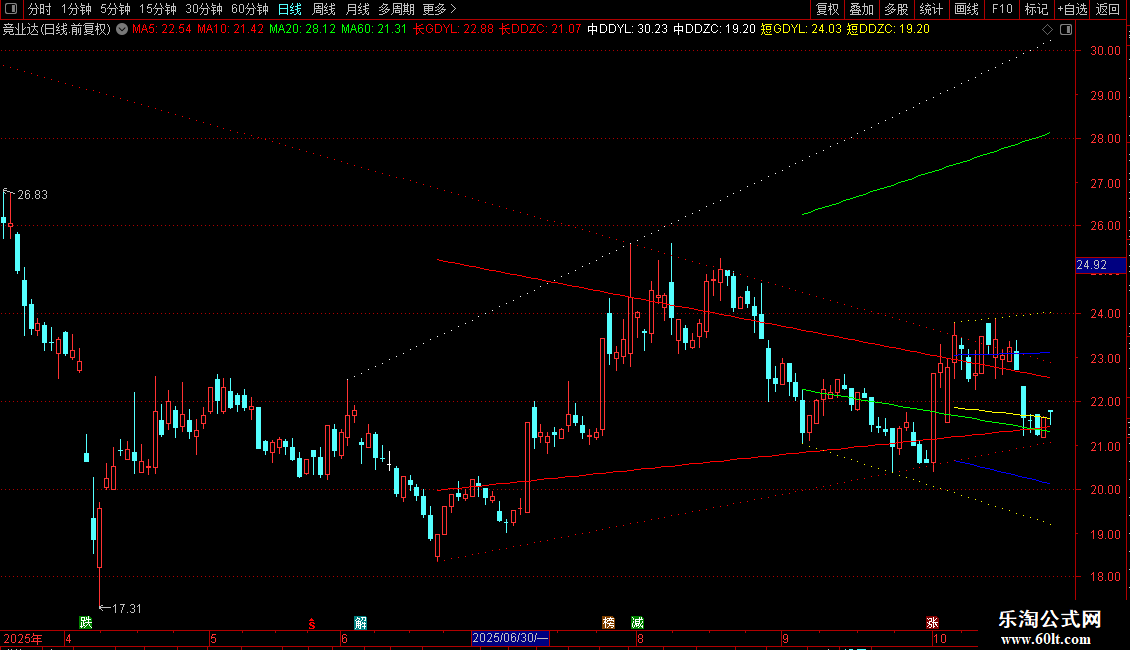 DDZC2赋值:当满足条件到最后交易的周期=LDDCS2时,在最低价位置画直线起点,当满足条件到最后交易的周期=LDDCS1时,在最低价位置画直线终点,1表示是否延长. 画白色