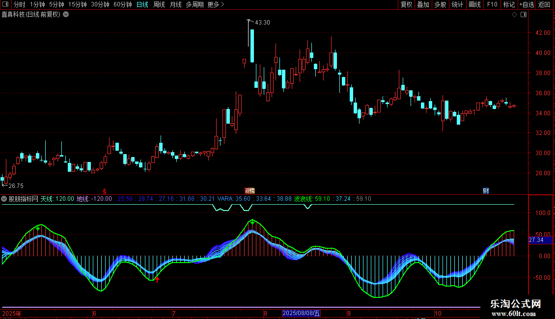 波浪线:SMA((VAR11-50)*2,3,1)+SMA((VAR10-50)*2,3,1)/2,LINETHICK2,COLORGREEN;
