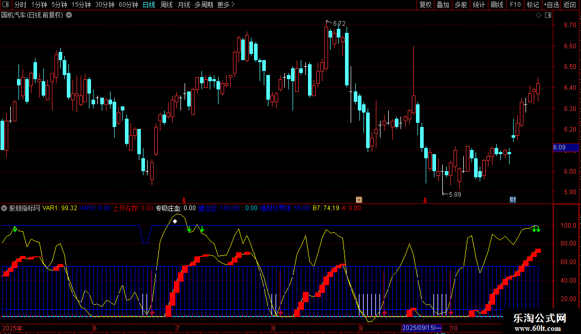 上升在即: IF(CROSS(VAR1,VAR2),50,0),STICK,COLOR0000CC,LINETHICK2;