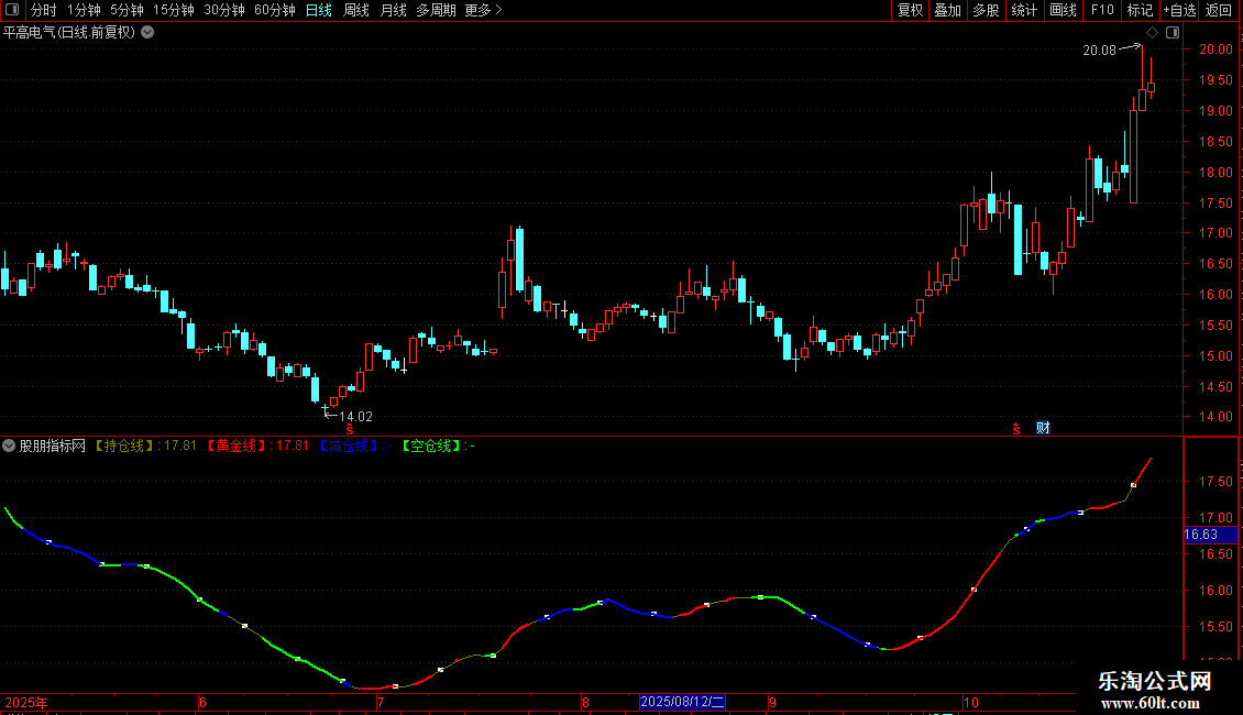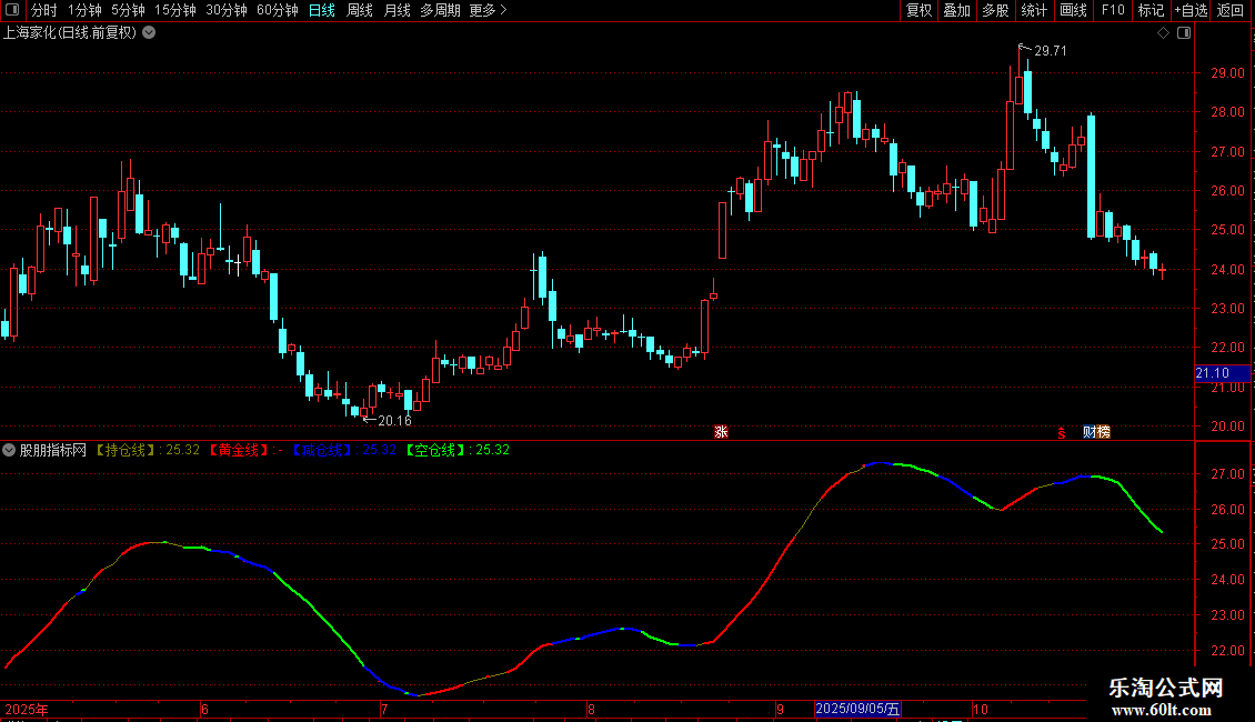 【减仓线】:IF(抛物线>C,【持仓线】,DRAWNULL),COLORBLUE,LINETHICK2;