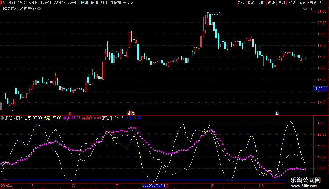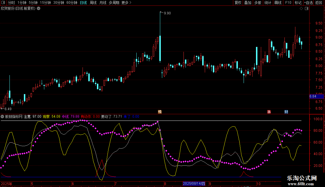 有动作:EMA(IF(LOW<=VAREA,(VARDA+VARFA*2)/2,0),3)/618*VAR10A,COLORRED;