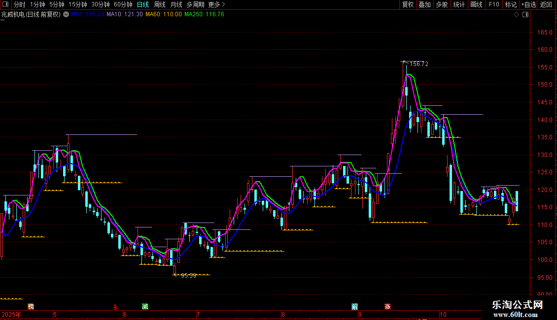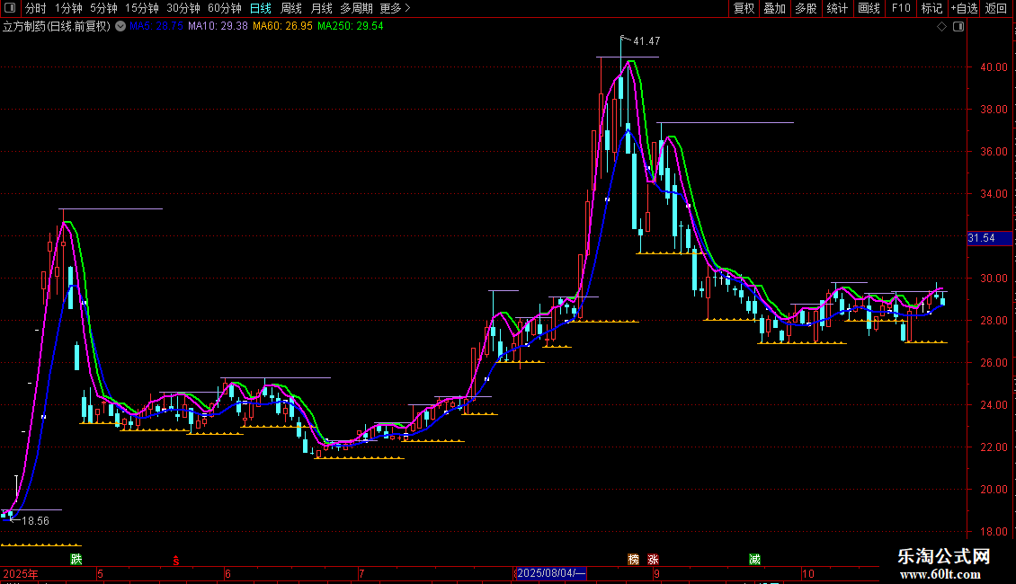 强势单线持股:LLV(MA(HIGH,(3)),1),LINETHICK2,COLORFF00FF;