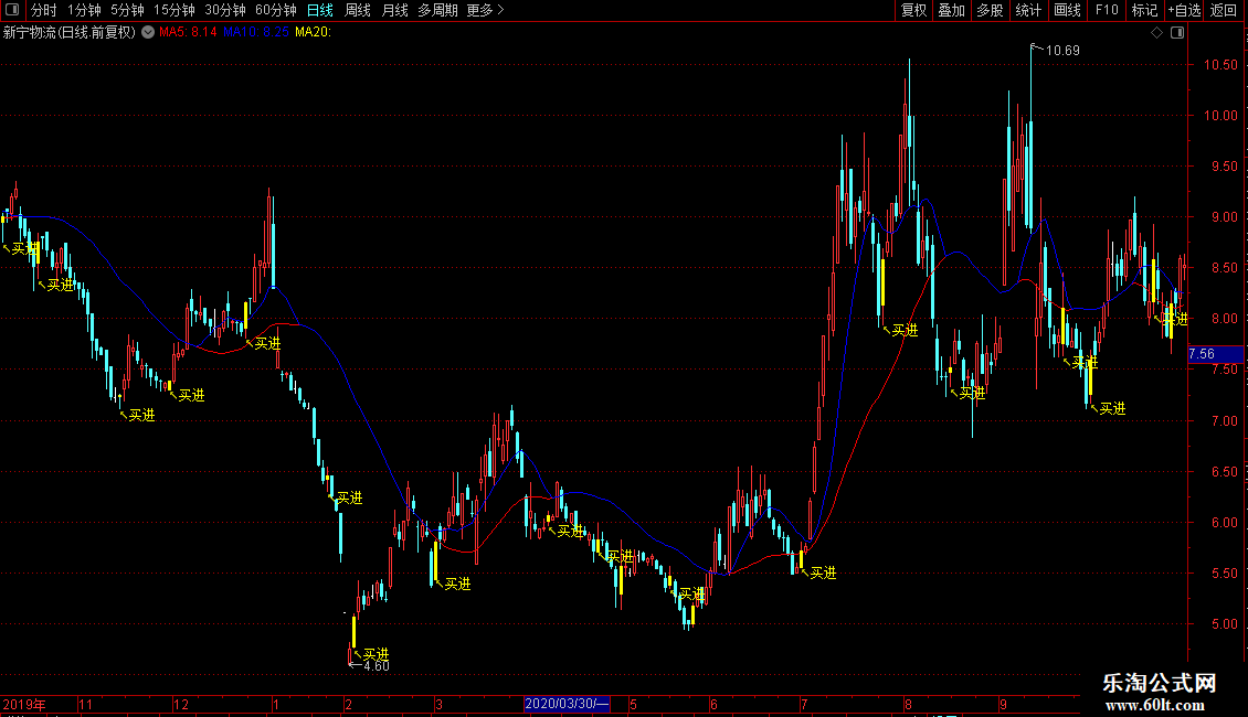 DRAWTEXT(FILTER(买=1,5),LOW-0.05,'↖买进'),COLORYELLOW;