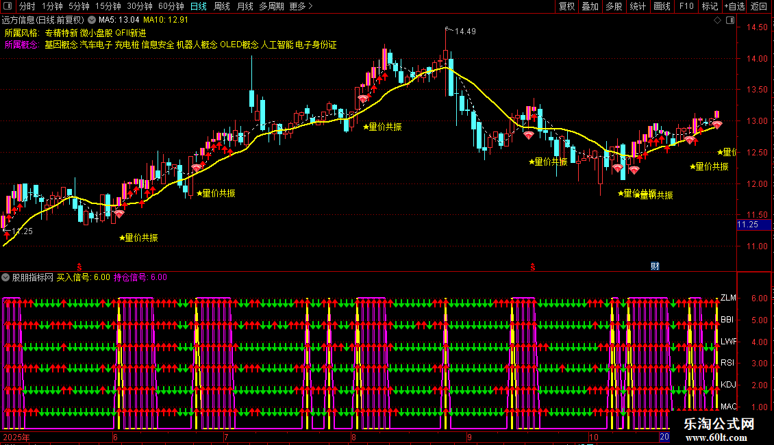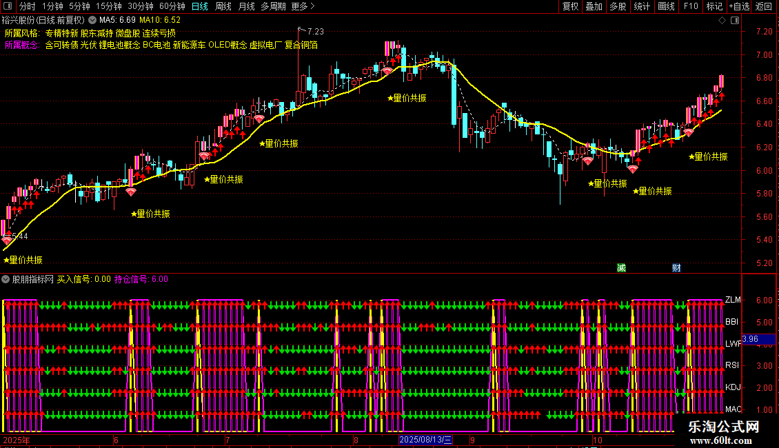 指标通过整合MACD、KDJ、RSI、LWR、BBI和动量指标,实现多指标共振判断买卖点。当所有指标同时发出金叉信号时,产生买入信号;持续满足条件则显示持仓信号。