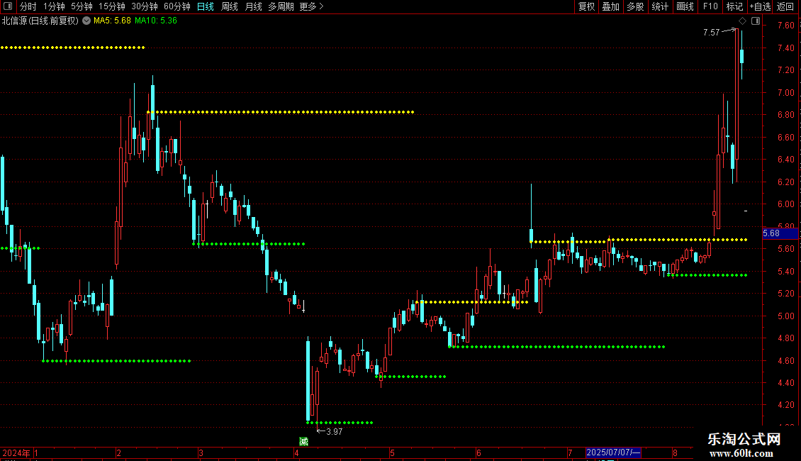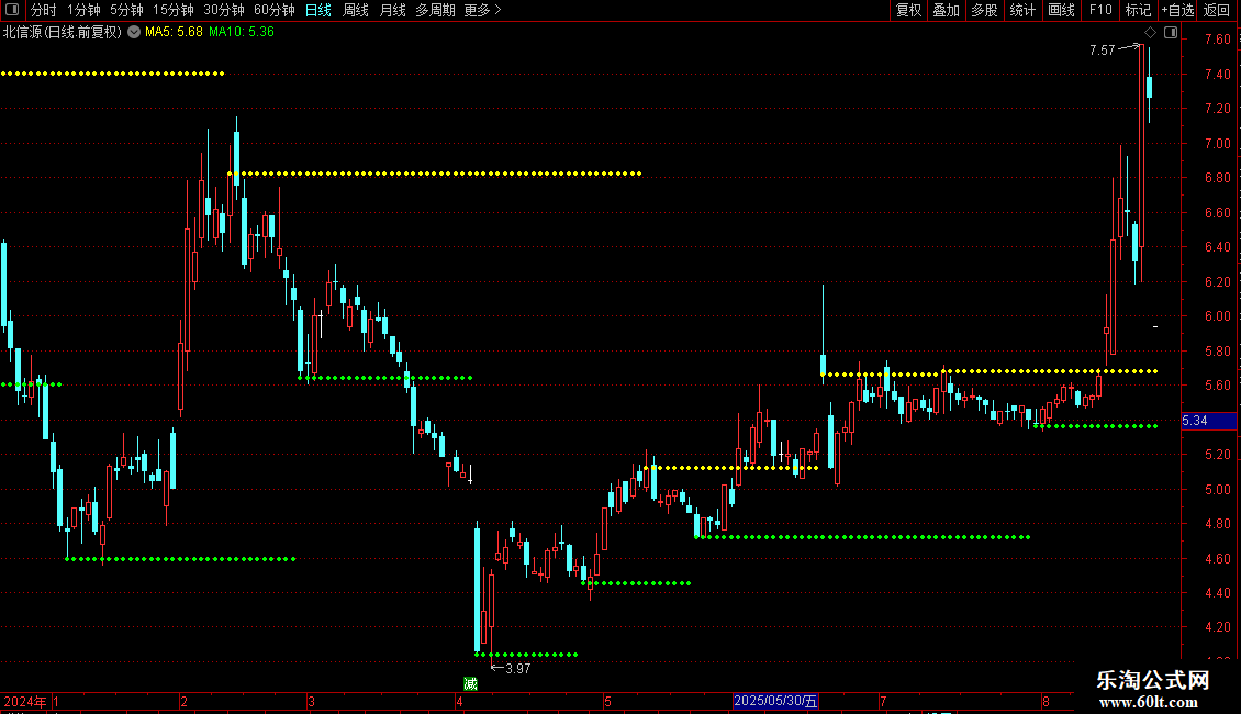 支撑:IF(T2,B,B),COLORGREEN,POINTDOT,LINETHICK4;
