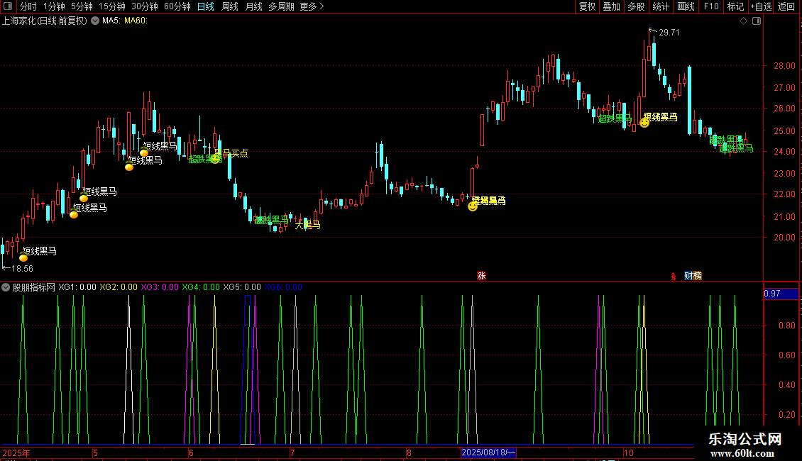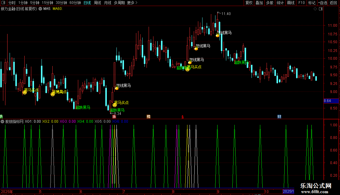指标通过多组均线交叉、动量强度和超跌反弹信号,识别股票短期强势起涨点。当短期均线上穿中长期均线且成交量放大时提示"黑马买点";在价格超跌区域结合动量反转捕捉"超跌黑马"机会;综合量价、波动率和趋势强度筛选出"大黑马"标的。