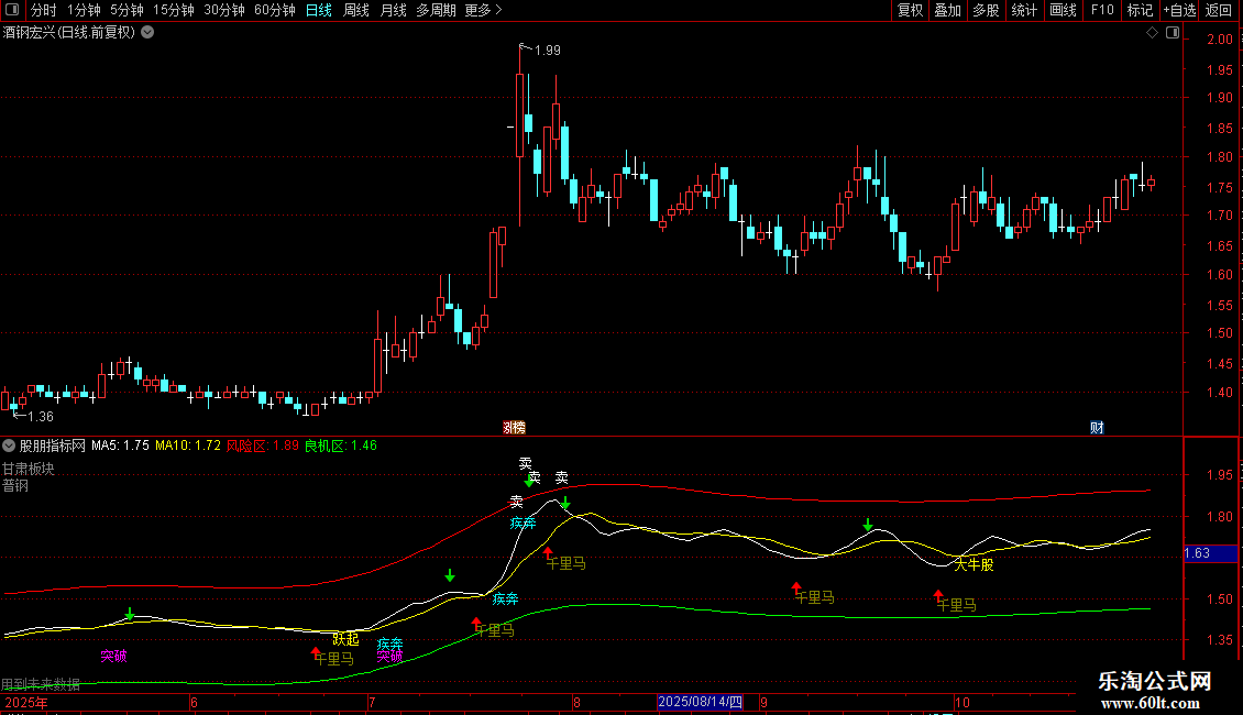 DRAWTEXT((ZIG(3,5)>REF(ZIG(3,5),1)) AND (REF(ZIG(3,5),1)<=REF(ZIG(3,5),2)) AND (REF(ZIG(3,5),2)<=REF(ZIG(3,5),3)),LOW*0.94,'千里马'),COLORBROWN;