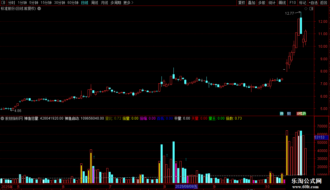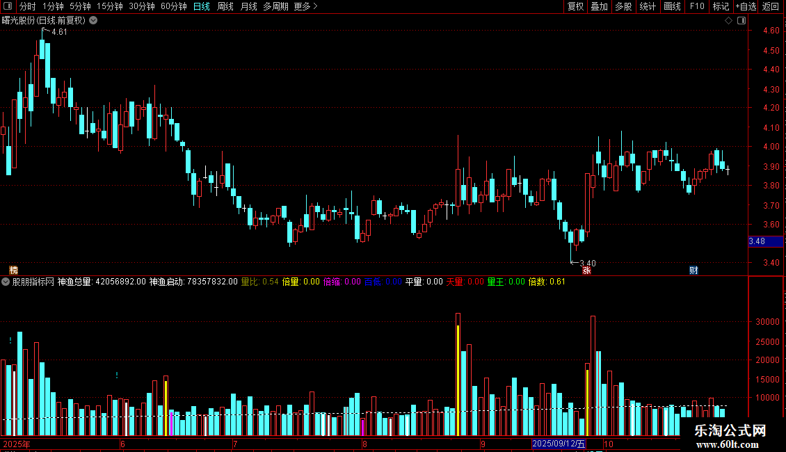 与传统的系统成交量指标比,神渔量能指标把成交量的变化规律用不同的颜色标示区分出来,并引入倍量、缩量、平量、百日低量、天量、量王的概念,使成交量的变化规律无所遁形,一目了然;传统的系统成交量指标用的是成交手数(受除权除息增发影响失真比较大),而神渔量能指标启用成交金额,更能真实的反应当天的成交情况,并弃用传统的一些指标线,独创一条动态的神渔启动线,成交量只有超过这条启动线,才有走牛的可能,这就给我们及时发现和抓住牛股、妖股提供了一个难得的契机,是量学喜爱者“攻城掠地”的必备良器。本指标参考了量学的成交量指标思路,在此表示诚挚的谢意!