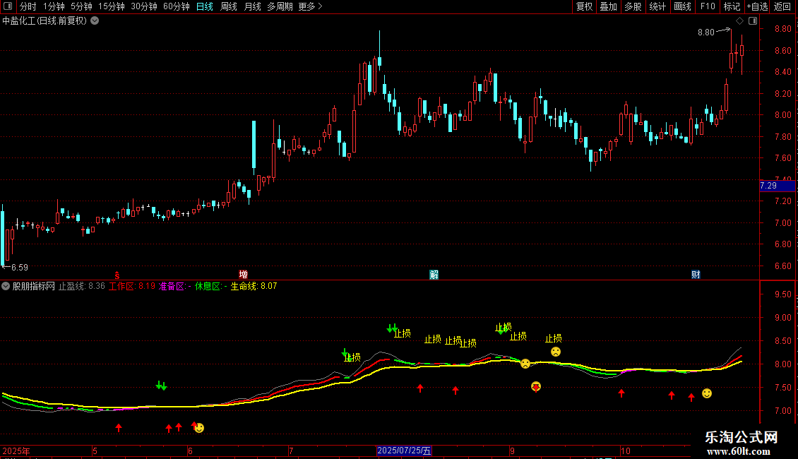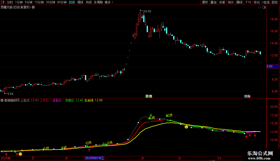 准备区:IF(C>=工作线 AND EMA(C,14)<EMA(C,25),工作线,DRAWNULL), COLORMAGENTA, LINETHICK2;