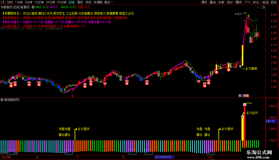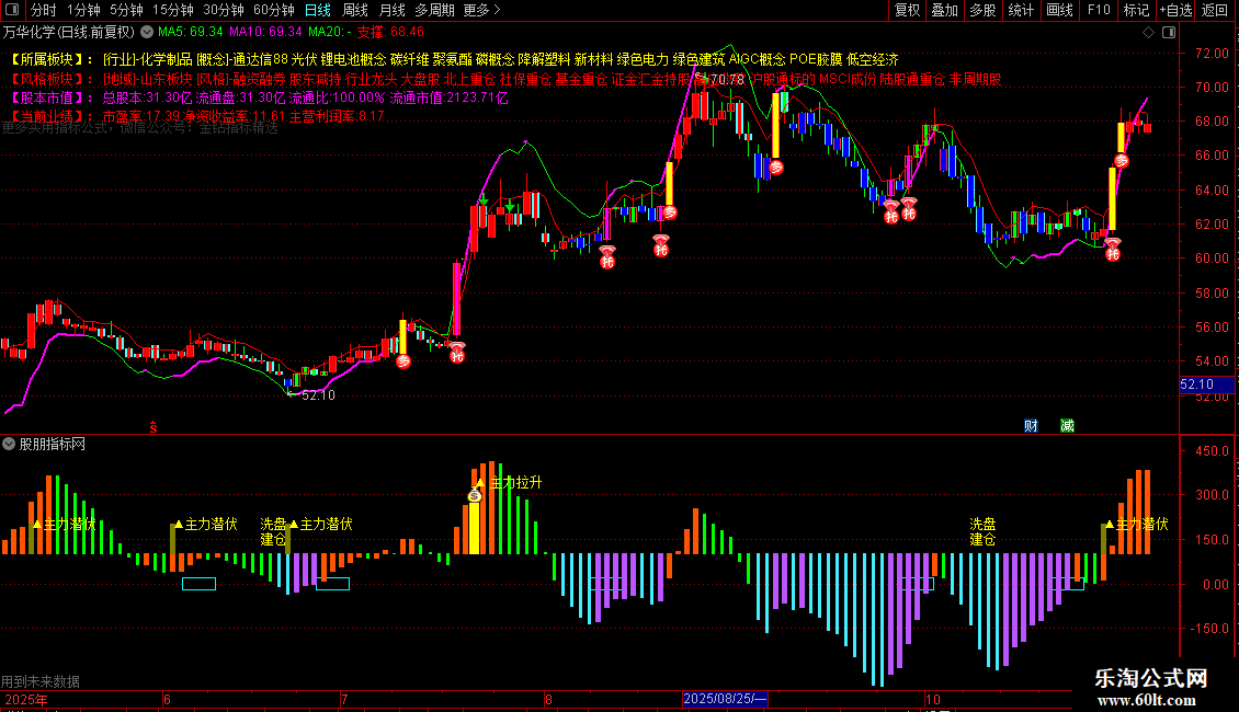 主要功能:通过多重技术指标综合判断股票买卖时机。它融合了价格趋势、动量变化、超买超卖状态和主力资金动向等多维度信号,在不同阶段给出明确的建仓、洗盘、主力潜伏等提示。