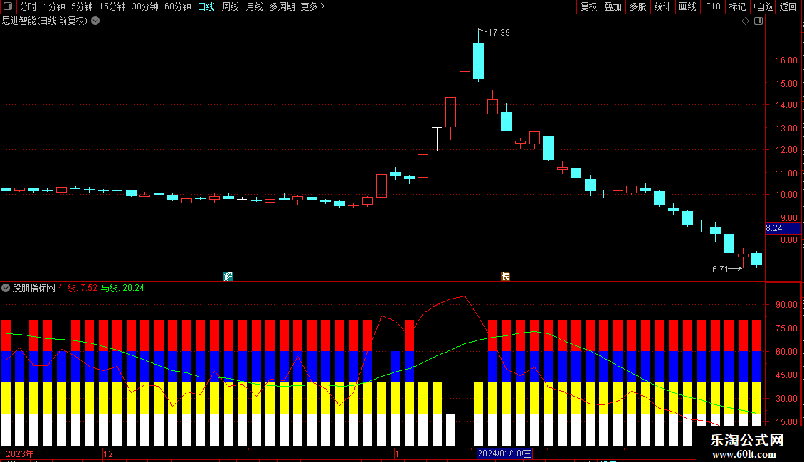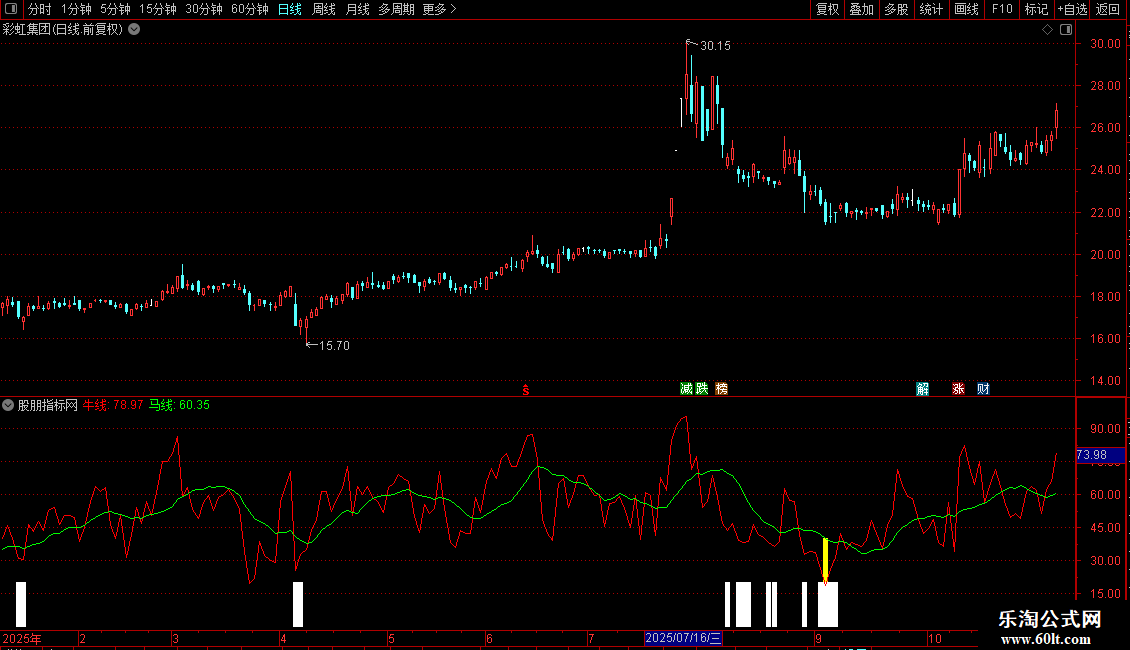 牛线:SMA(MAX(CLOSE-REF(CLOSE,1),0),N,1)/SMA(ABS(CLOSE-REF(CLOSE,1)),N,1)*100,COLORRED;
