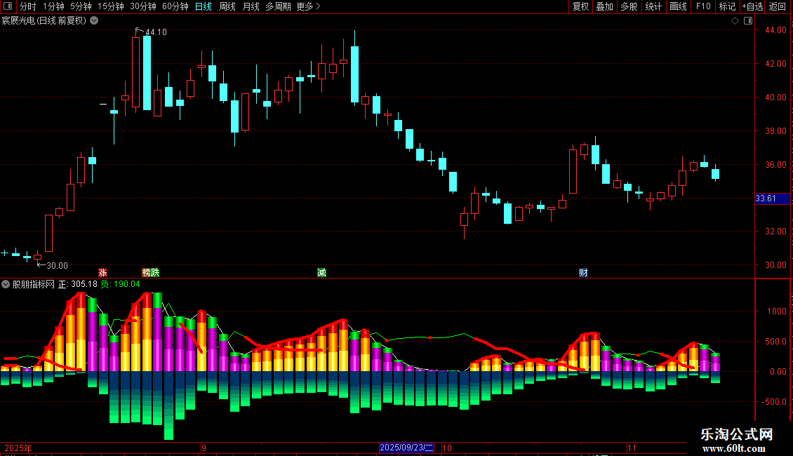 当满足条件正>0AND正>1日前的正时,在正*2/5和0位置之间画柱状线,宽度为1.5,0不为0则画空心柱.,COLOR00DDFF