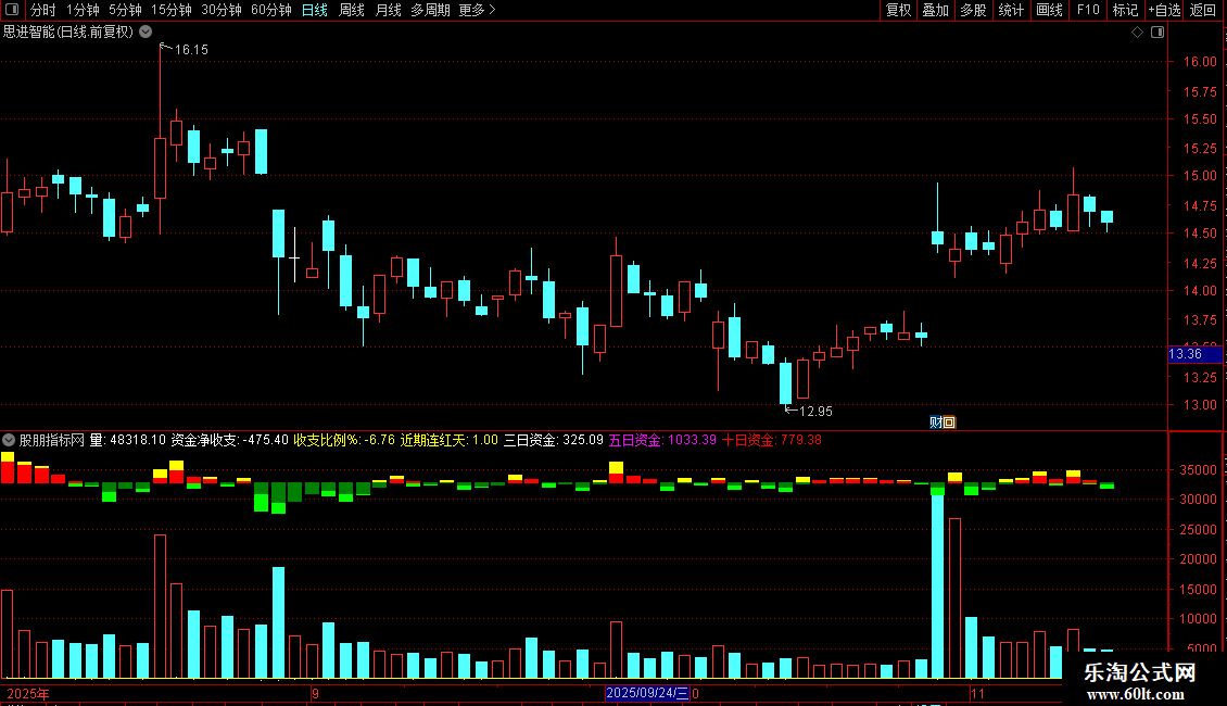 资金净收支:IF((HSL*0.4+LLJX)>0,资金流入,资金流出),COLORWHITE,POINTDOT;