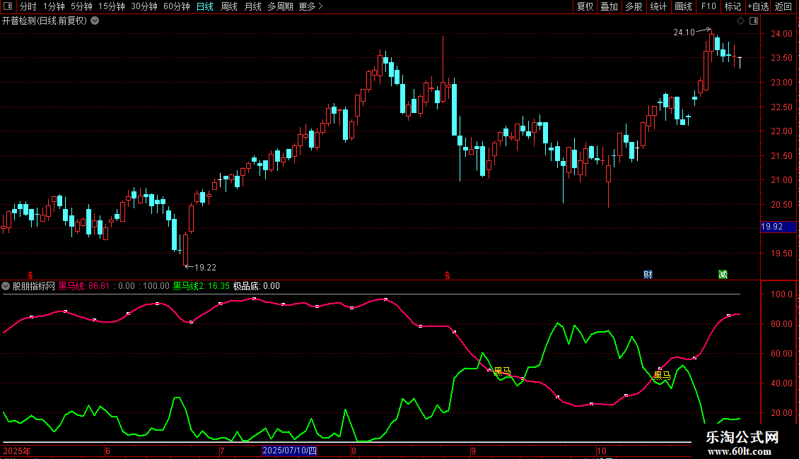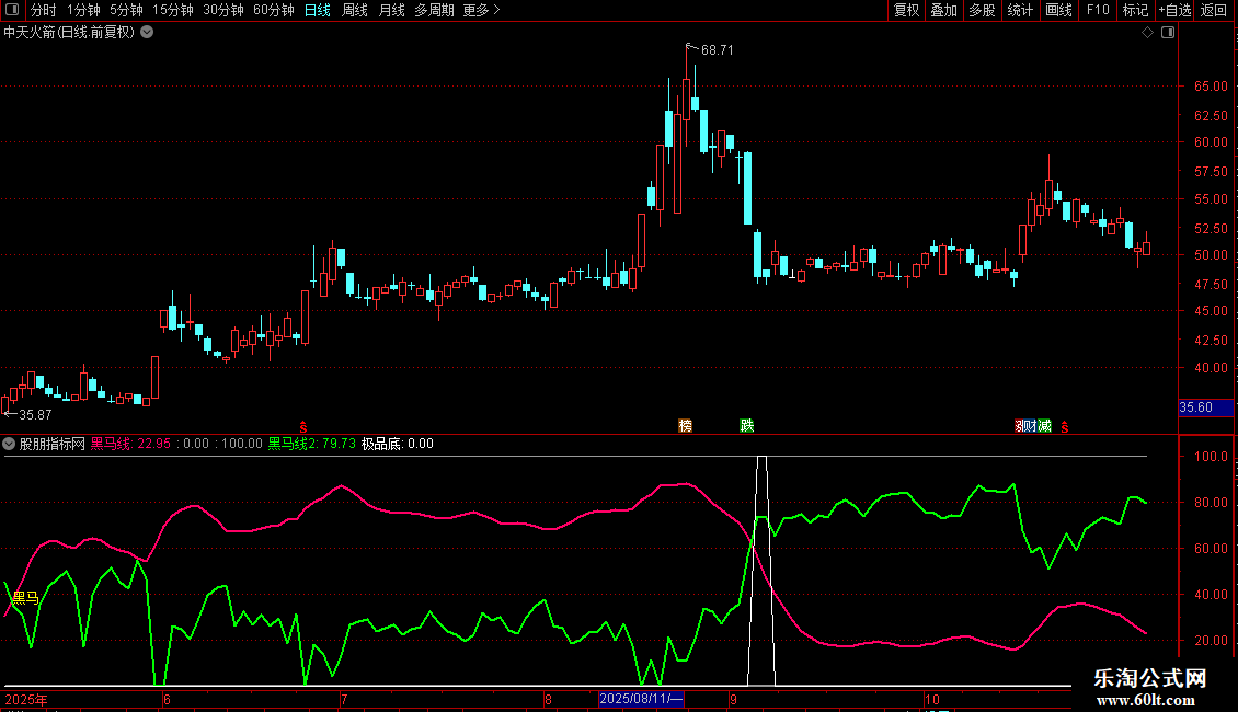 黑马线2:100*(HHV(HIGH,60)-CLOSE)/(HHV(HIGH,60)-LLV(LOW,60)),LINETHICK2,,;