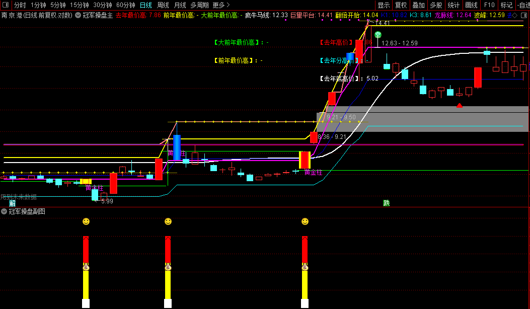 本指标系统为投资者提供全方位的技术分析支持,核心功能涵盖关键价位识别与趋势动向判断。它自动标记最近三年内的年度最高价位,直观展示长期压力水平;同时绘制疯牛马线、龙脉线等特色趋势轨道,辅助辨别多空强弱。指标还能标注巨量成交平台与阶段性起涨点,提示重要支撑与突破位置。