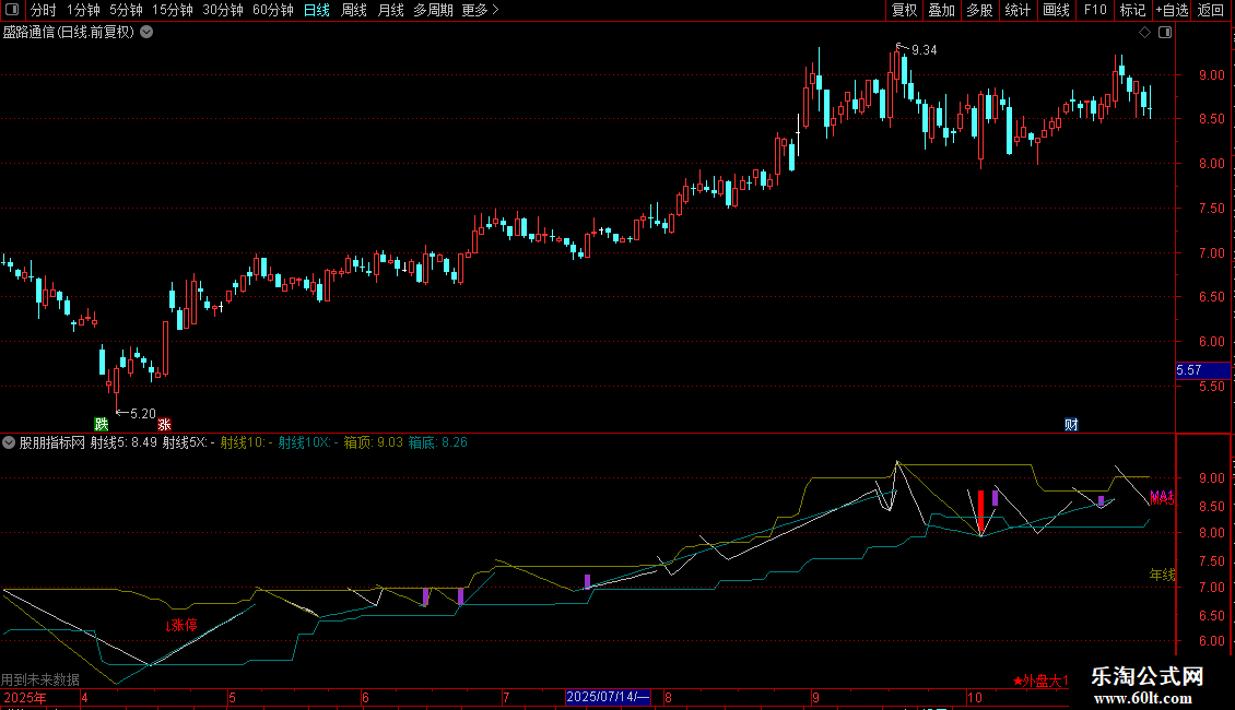 射线5X: DRAWLINE(L=LLV(L,5),L,H=HHV(H,5),L,0),COLORLIGRAY;