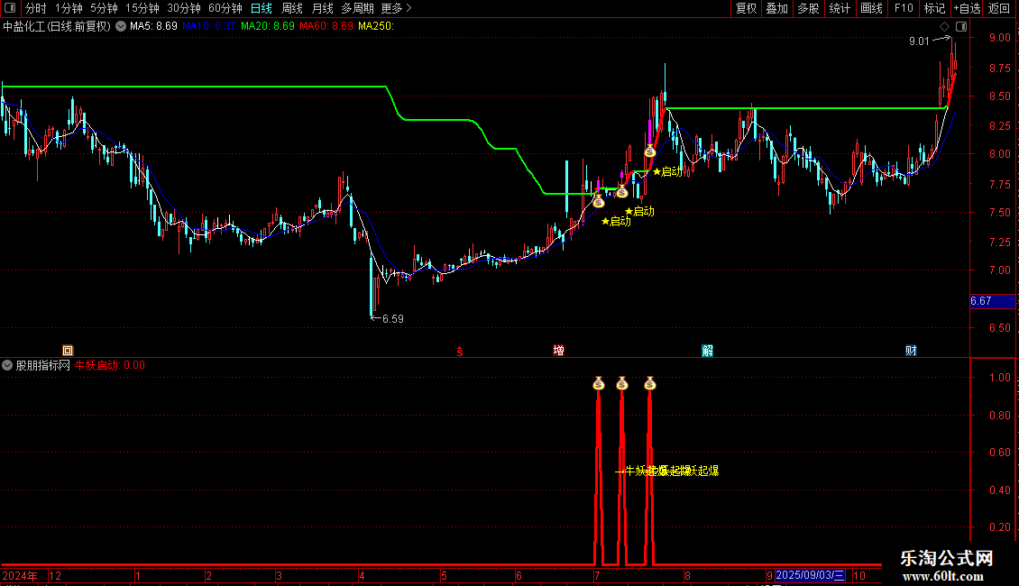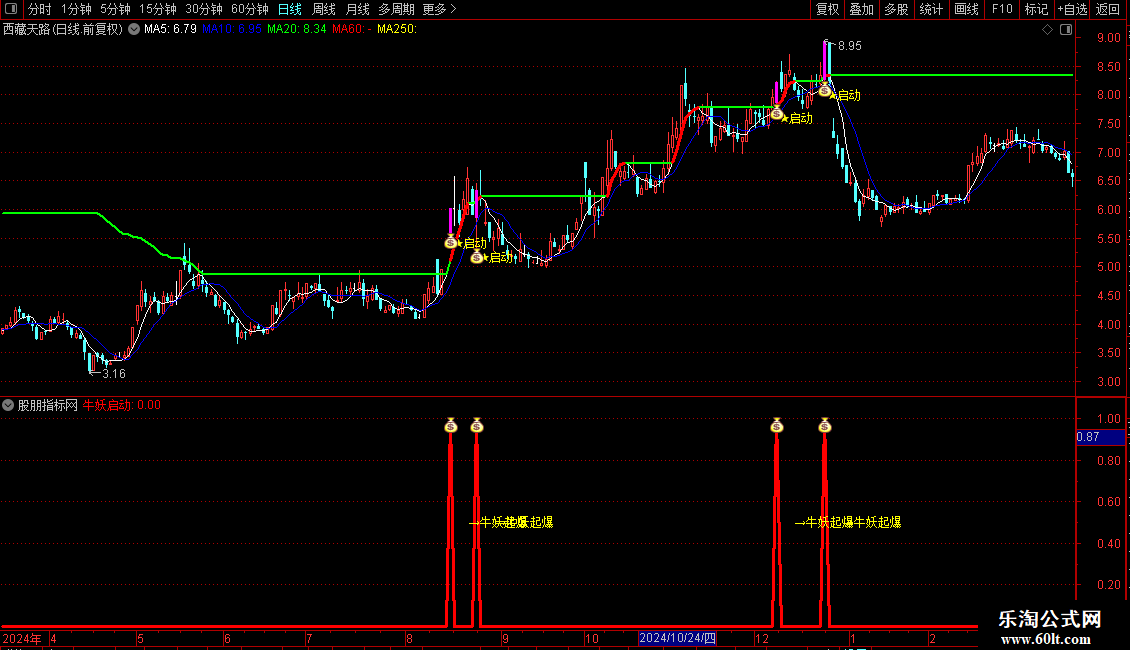 操作策略:当“牛妖启动”信号出现且当日收阳线时,视为潜在买入机会。 该信号需结合价格突破长期趋势线、特定K线组合(如前期大阳线+当前小实体阳线)共同确认。