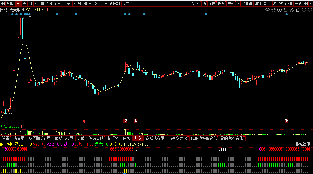 X17赋值:100*成交量(手)/(流通股本(股)/100),画黄色,NODRAW