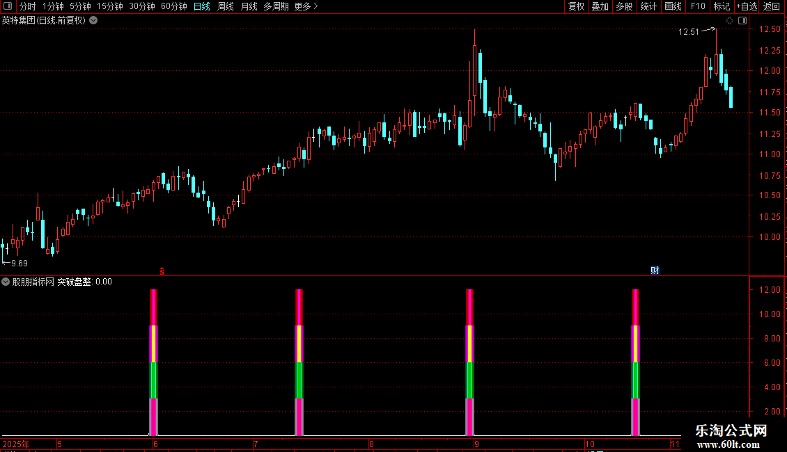 DRAWTEXT(突破盘整,1.5,''),COLORRED;