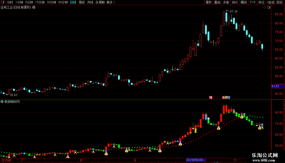 STICKLINE(CLOSE> REF(CLOSE,1),HIGH,LOW,0,0 ),COLOR000DDD;