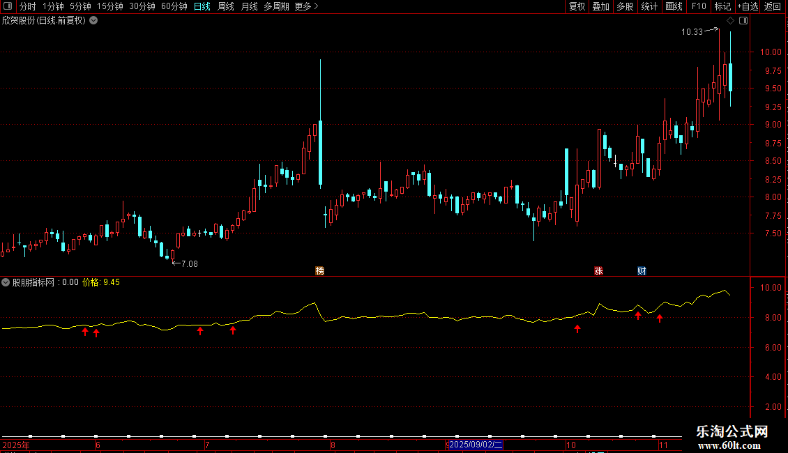 当趋势强度突破其均线且随机指标的慢线开始拐头向上时,标记买入信号。