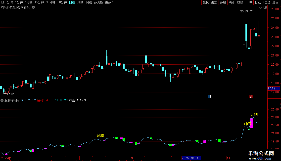 DRAWTEXT(CROSS(RSI,80),H*1.03,'↓调整'),COLORYELLOW;