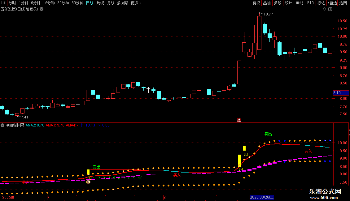 AMA2:EMA(DMA(CLOSE,CQ2),2),COLORLIBLUE,LINETHICK2;