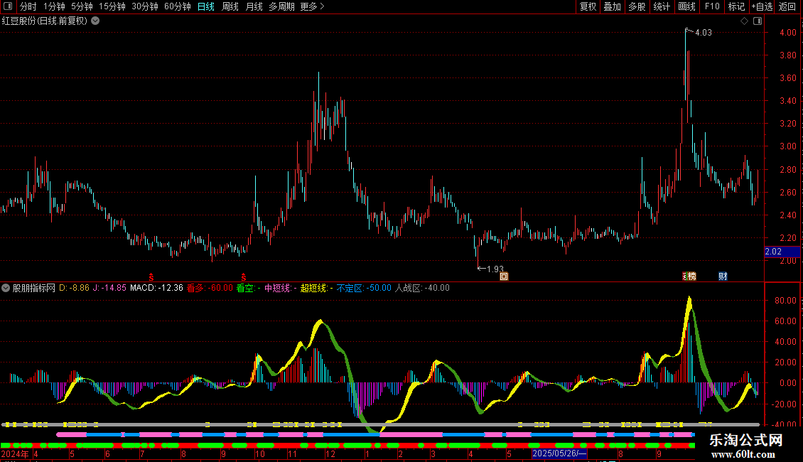 中短线:IF(J>D,-50,DRAWNULL),LINETHICK7,COLORCC66FF;