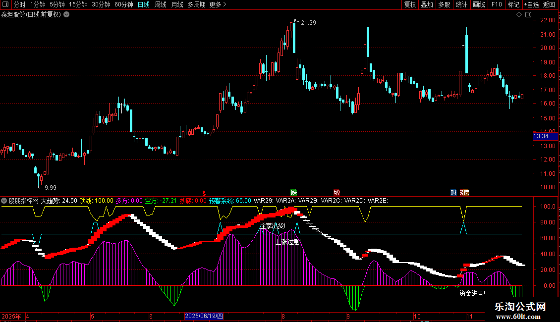预警系统: IF(VAR7>=200 AND VAR6>=150 OR CROSS(65,多方),15,IF(VAR7<=-200 AND VAR6<=-150,-15,VAR9))+65,COLORCYAN;
