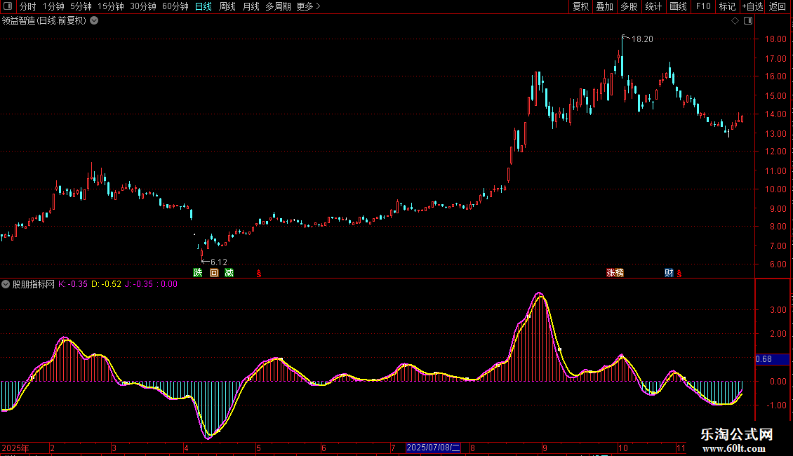 KDJ因其快速响应的特点而受到普遍应用,其指标设计因包含了最高价、最低价和收盘价,故从理论上来说比MACD携带更多信息,但其自身所蕴含的先天缺陷使其容易出现高位和低位钝化,并且KDJ自身频繁交叉易产生虚假交易信号,斯蒂芬超级KDJ从原理入手,有效消除了传统KDJ易高位钝化、交易信号频繁的缺陷,并将KDJ金叉的准确率提高了大约4%,更重要的是,斯蒂芬超级KDJ本身成为了一个正向盈利的策略。另外给出创业板4037点时的斯蒂芬KDJ的有效顶背离图形,供各位股友参考。