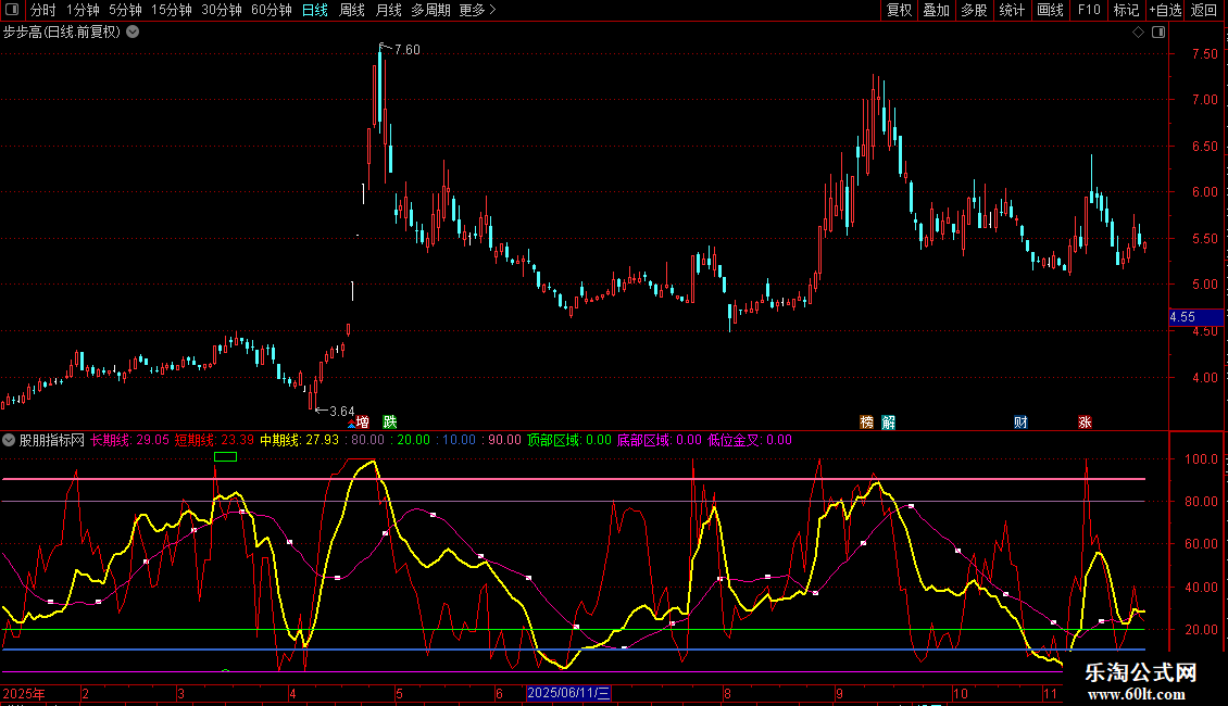 顶部区域:(中期线<REF(中期线,1) AND REF(中期线,1)>80) AND (REF(短期线,1)>95 OR REF(短期线,2)>95 ) AND 长期线>60 AND 短期线<83.5