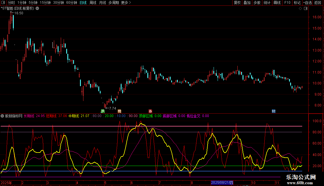 OR (长期线<8 AND 中期线<7 AND 短期线<15 AND 短期线>REF(短期线,1)) OR (长期线<10 AND 中期线<7 AND 短期线<1) ,COLORMAGENTA;