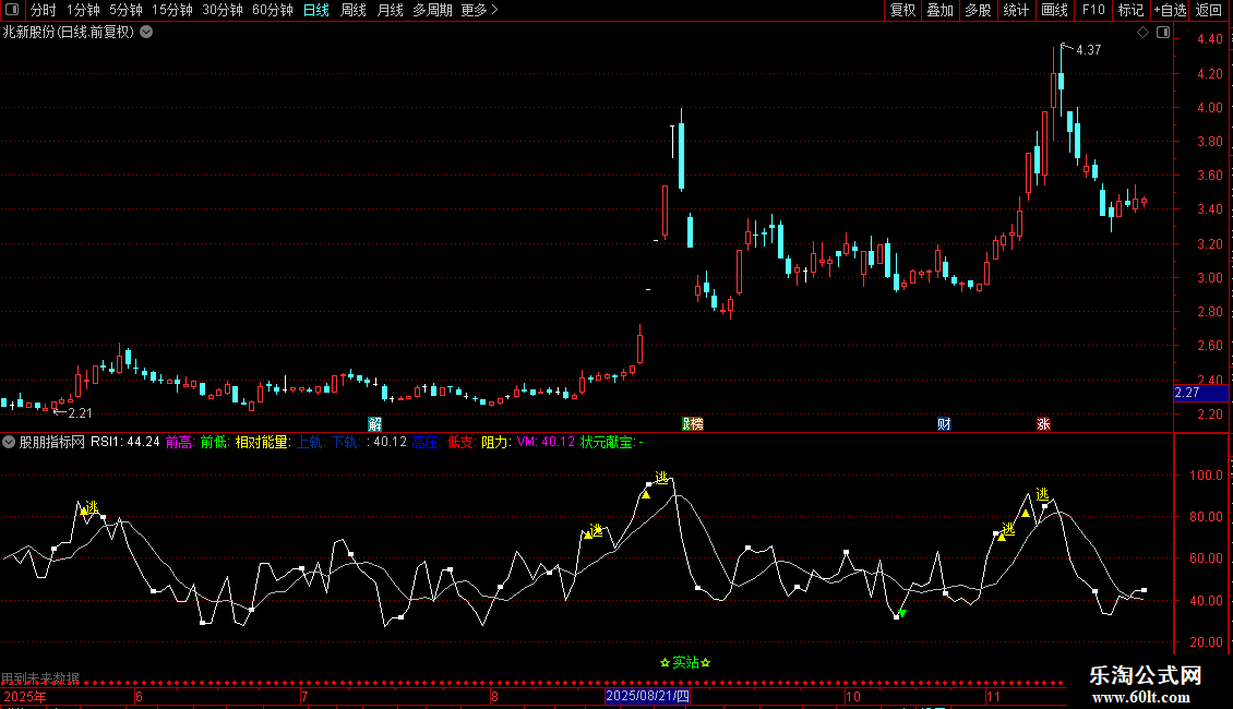 DRAWTEXT(CROSS(低,RSI1),MID,'年低'),COLORYELLOW;